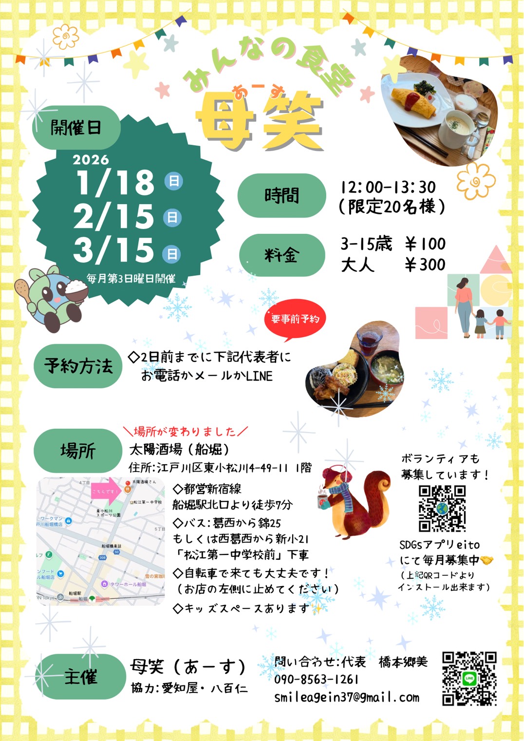 みんな食堂母笑(あーす)2月3月開催日のお知らせ